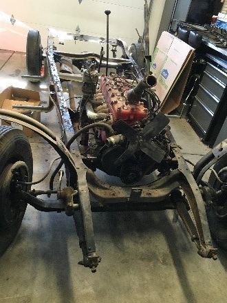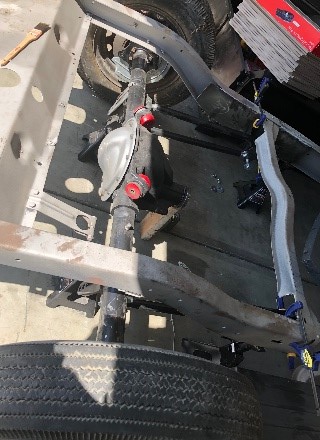 The frame and body go to the stripper–forgot her name 😊. Then the body goes to the paint shop to be primed to protect the metal while I work on the body. The frame comes back to my garage and I installed a Mustang 4-11 rear end from a Cobra GT and added the rear disc brakes and air bags. The front end gets stripped off and I install a Mustang II IFAS front suspension with airbags and disc brakes.