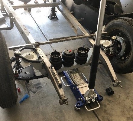 At this point, the crossmember is in and tack welded, the top hats are tacked in, spindles are on. The rear axle is in with the four-link tacked in; the air bag supports are also tacked in. The pan hard needs to set after the engine is on and the truck is sitting on its own weight. It is time to set the engine and see if I have the clearances that I need for headers and dual quads to sit under the hood. Keep in mind, I want the exterior to look completely original.